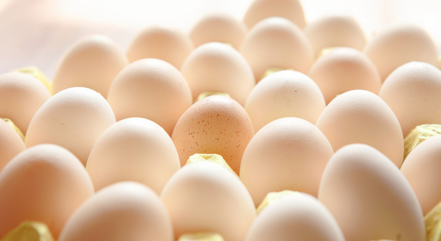 A crate of white eggs in the light.
